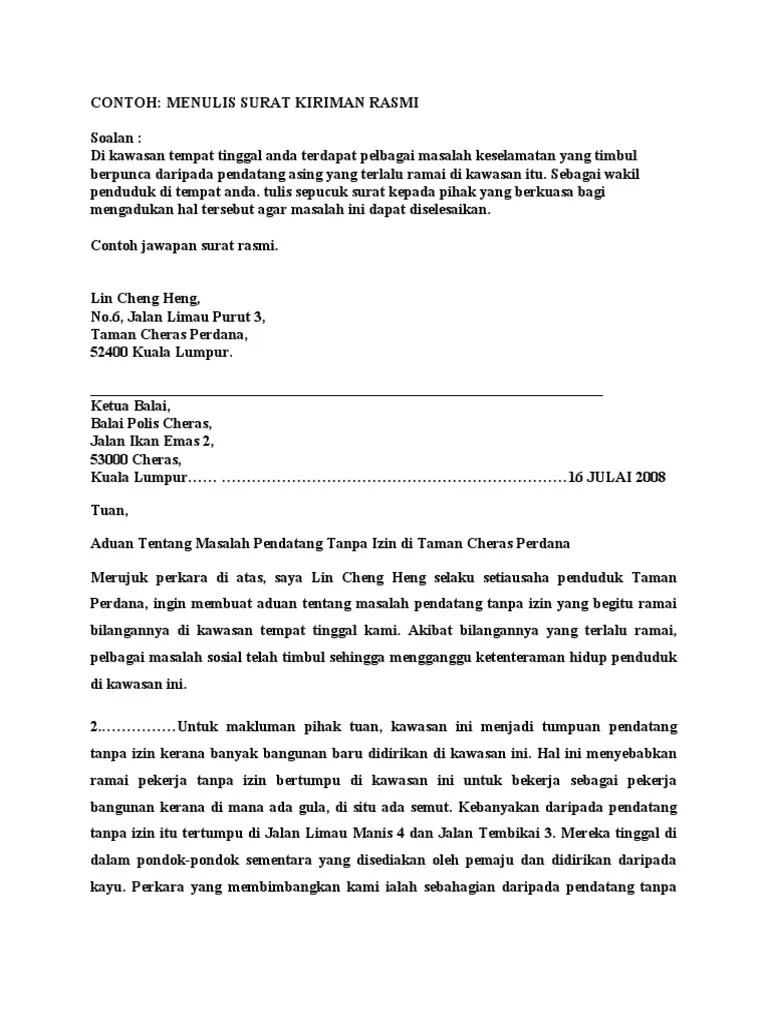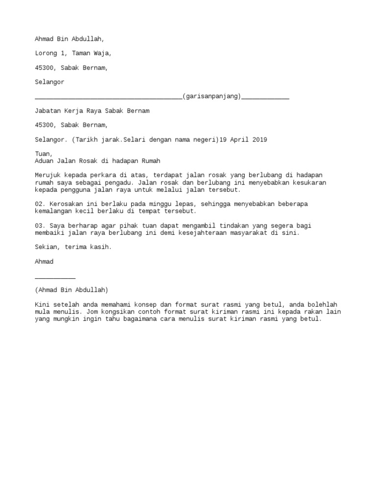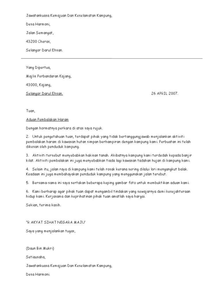 Aduan keselamatan dan kebersihan perumahan apartment seri kayangan lok kawi height. Surat rasmi ditulis bagi kepentingan umum dan ditulis secara formal. Surat kiriman rasmi adalah surat bertajuk yang singkat dan padat tanpa ayat panjang dan bahasa kiasan. 6 contoh pendahuluan menyatakan hal / tujuan merujuk perkara di atas, saya ingin membuat aduan mengenai pemilik binatang peliharaan yang tidak bertanggungjawab di kawasan perumahan summerville point. Kompetisi ibl resmi menjadi kompetisi olahraga nasional pertama yang akan dihelat di masa. Surat aduan surat permohonan surat bantahan surat pesanan surat rayuan 5. Sebagai setiausaha persatuan penduduk, anda diminta untuk menulis surat kepada pihak berkuasa tempatan. Format surat kiriman rasmi by cikgu wanie lovela. Selain surat berbentuk aduan, surat rasmi juga digunakan untuk permohonan, ucapan tahniah, pemberitahuan dan banyak lagi bergantung kepada jenis urusan. Surat rasmi, surat rasmi format, surat rasmi kerajaan, surat rasmi contoh, surat rasmi syarikat, surat rasmi berhenti kerja, surat rasmi per. Format dan panduan menulis surat kiriman rasmi berbentuk aduan berserta contoh. Contoh soalan ujian saringan darjah 1. Surat memohon kebenaran by hafizd zulhasni 36638 views.